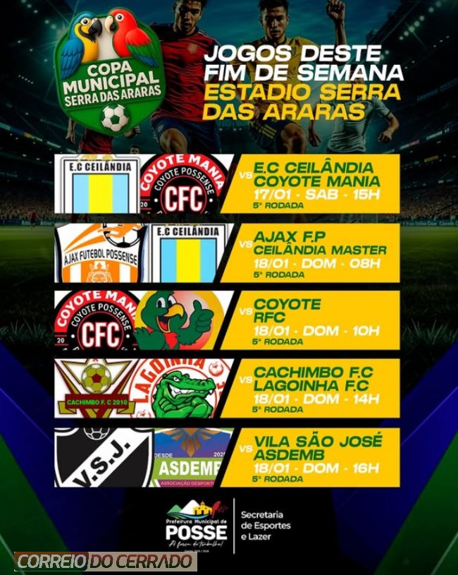 A Secretaria de Esportes e Lazer da Prefeitura Municipal de Posse convida toda a comunidade para comparecer ao estádio, prestigiar os jogos, torcer e apoiar os atletas que representam o esporte local.