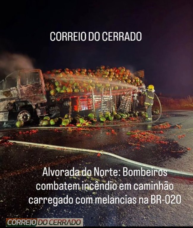 Alvorada do Norte: Bombeiros combatem incêndio em caminhão carregado com melancias na BR-020