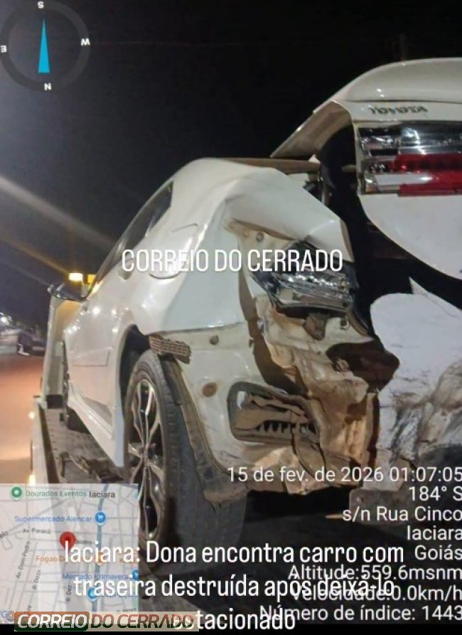Na madrugada deste domingo, 15 de Fevereiro, por volta da 01h00, a proprietária de um veículo foi surpreendida ao retornar para buscá-lo e encontrá-lo com uma forte colisão na parte traseira, em Iaciara/GO.
