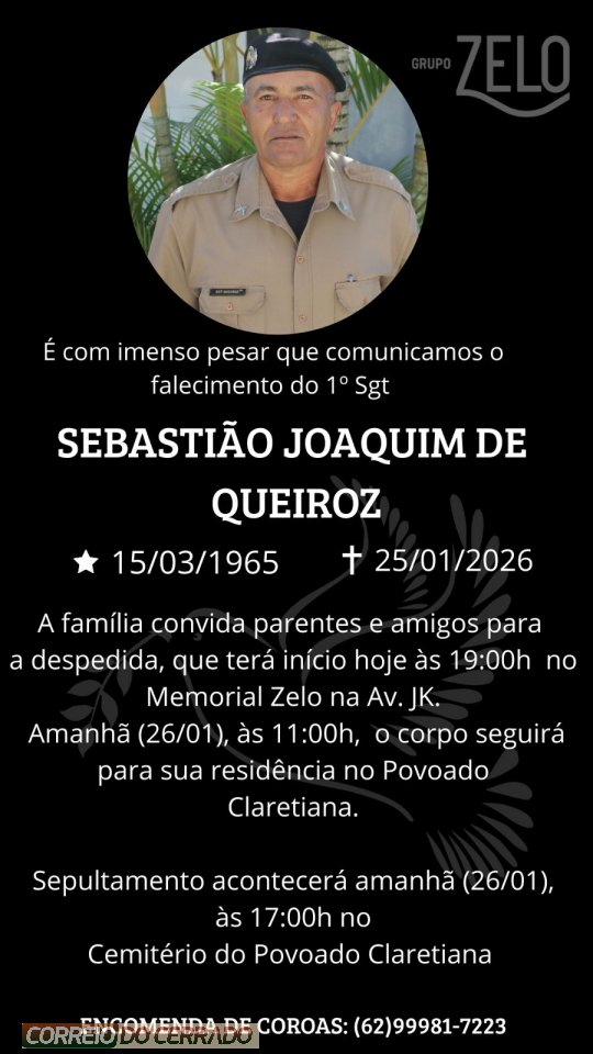 O Grupo Zelo e a família de Queiroz, comunicam com pesar o falecimento de Sebatiao Joaquim De Queiroz, ocorrido neste sábado (24), aos 61 anos de idade.