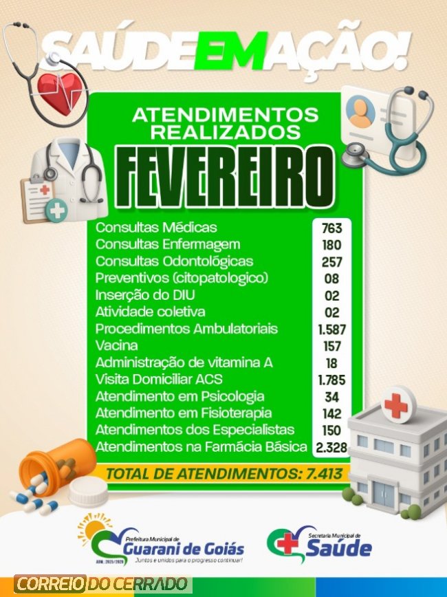 A Prefeitura de Guarani de Goiás, por meio da Secretaria Municipal de Saúde, informou que realizou 7.413 atendimentos ao longo do mês de fevereiro na rede municipal. Os serviços contemplaram diferentes áreas da saúde e tiveram como objetivo ampliar o acesso da população a atendimentos e procedimentos essenciais.