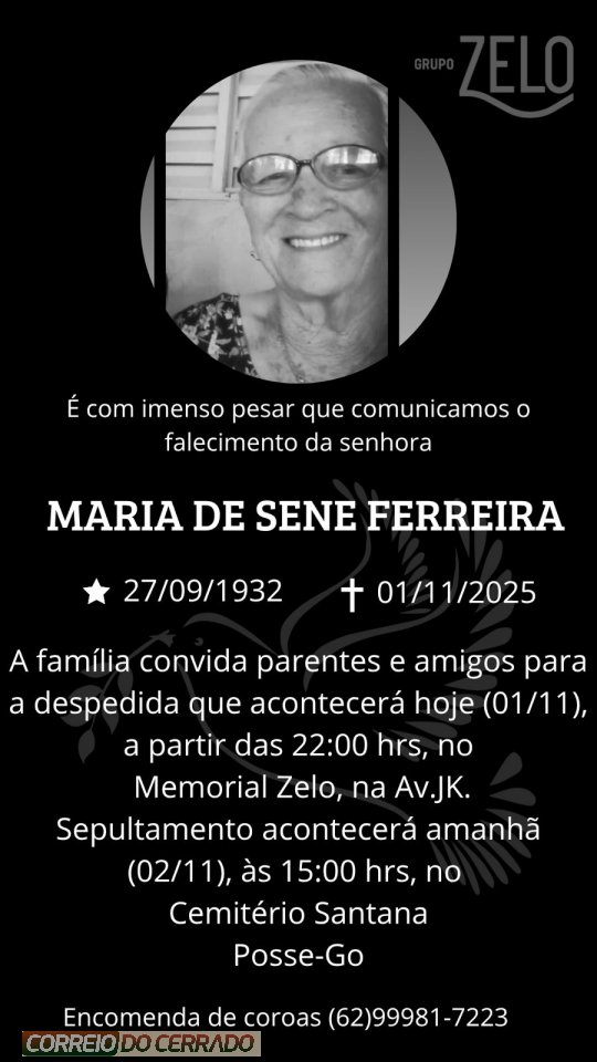 O Grupo Zelo e a família da Ferreira, comunicam com pesar o falecimento de Maria de Sene Ferreira, ocorrido neste sábado (01), aos 93 anos de idade.