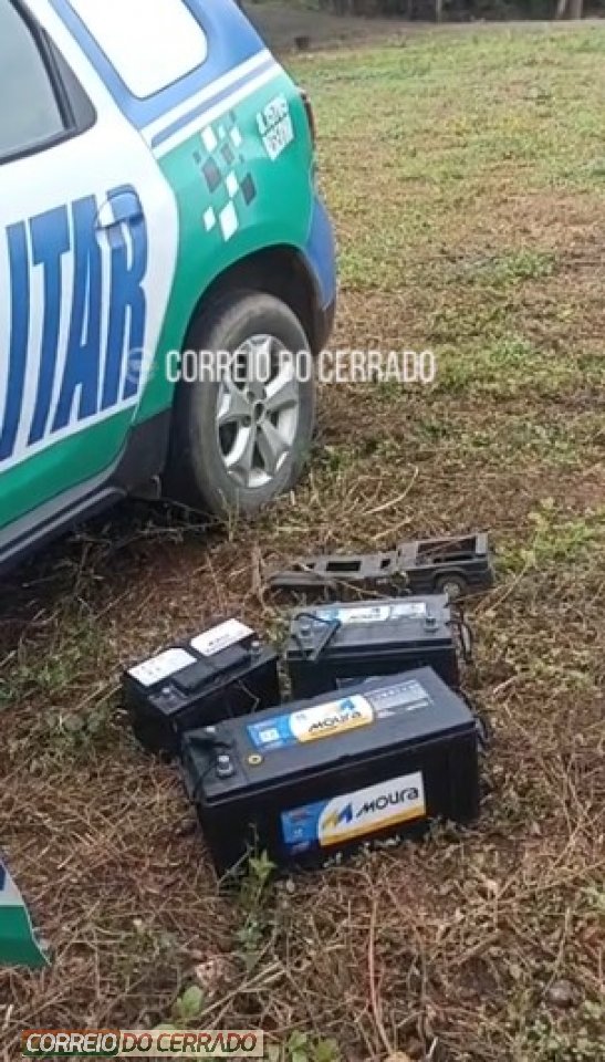Durante patrulhamento pela GO-236, no município de Simolândia/GO, os policiais localizaram o veículo parado em uma chácara às margens da rodovia, com dois indivíduos próximos. Na abordagem e busca veicular, foram encontradas três baterias furtadas, além de uma quarta bateria sem comprovação de origem.