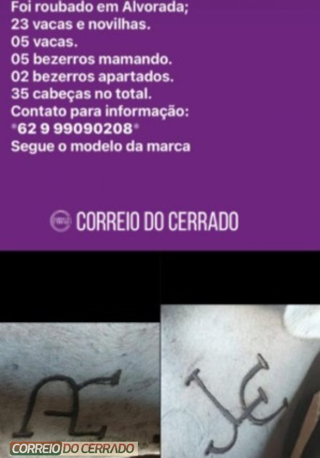 Quem tiver qualquer informação sobre o paradeiro do gado pode entrar em contato pelo telefone (62) 99909-0208.