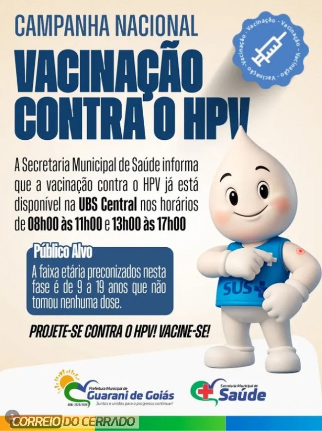 A Secretaria Municipal de Saúde de Guarani de Goiás informa que a vacina contra o Papilomavírus Humano (HPV) está disponível na UBS Central. A imunização é uma das principais formas de prevenção contra o vírus, que pode causar diversos problemas de saúde no futuro.