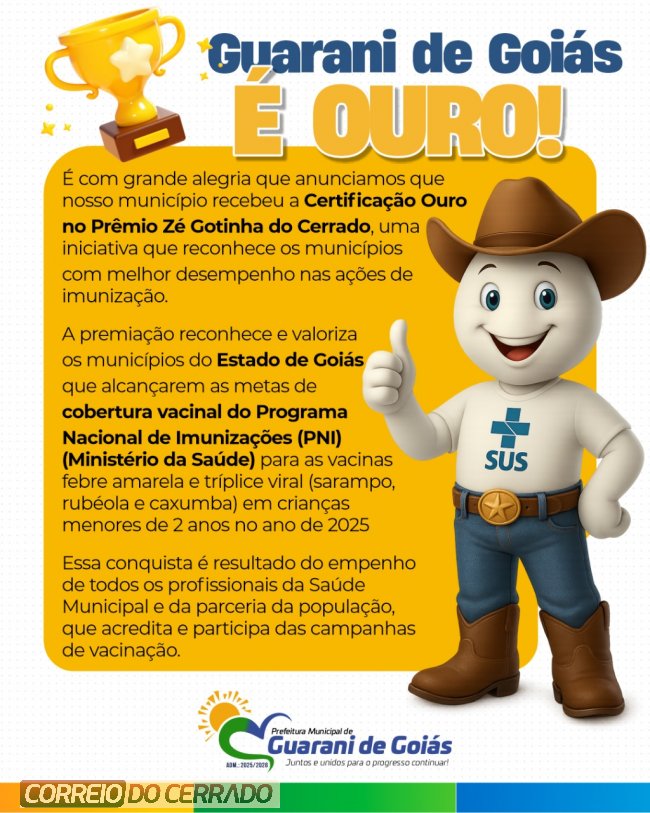 Guarani de Goiás recebeu a Certificação Ouro no Prêmio Zé Gotinha do Cerrado, iniciativa que reconhece os municípios com melhor desempenho nas ações de imunização.