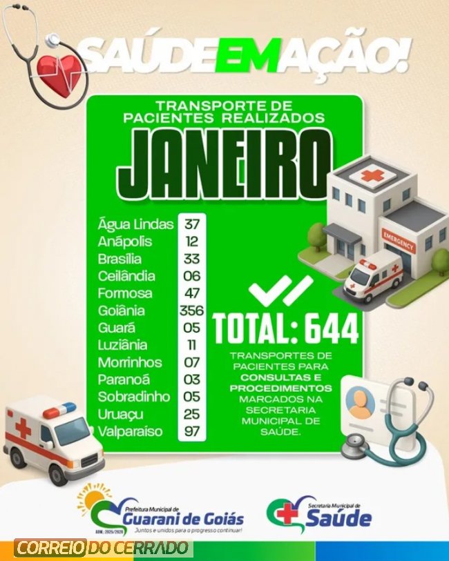 A Secretaria Municipal de Saúde de Guarani de Goiás divulgou o relatório oficial do transporte de pacientes referente ao mês de janeiro, reforçando o compromisso da gestão com o acesso digno, ágil e humanizado aos serviços de saúde.