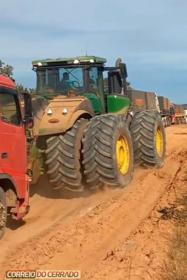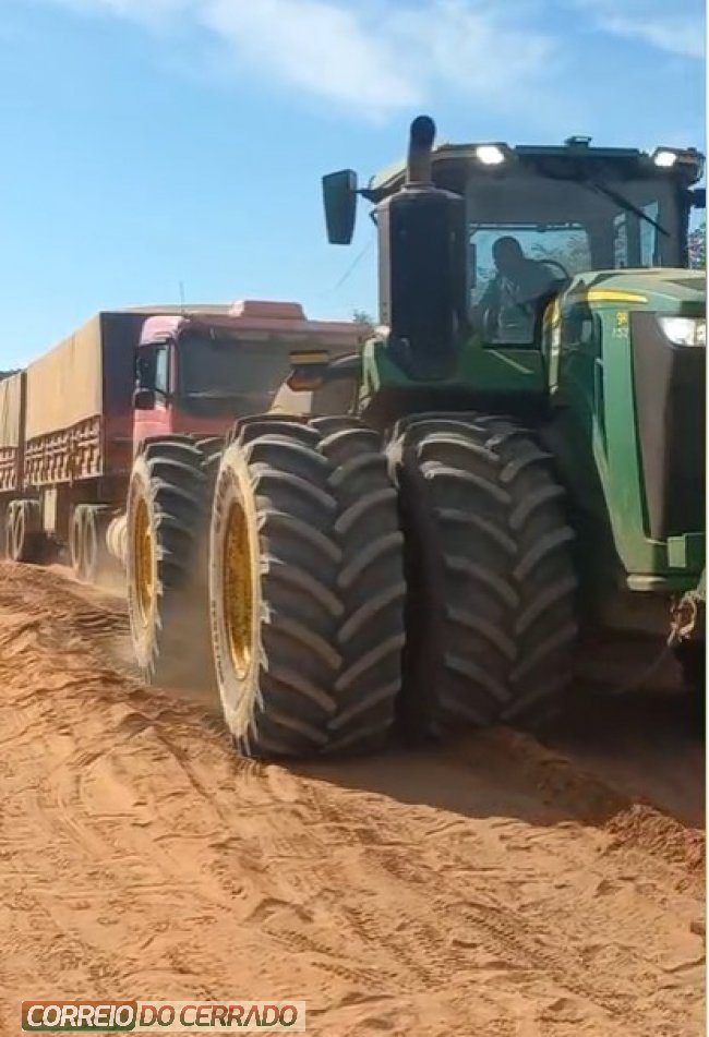 Imagens registradas no local mostram o momento em que o trator realiza o resgate de um caminhão atolado, evidenciando os desafios enfrentados diariamente pelos trabalhadores rurais para manter a logística ativa, especialmente em períodos de condições climáticas adversas.