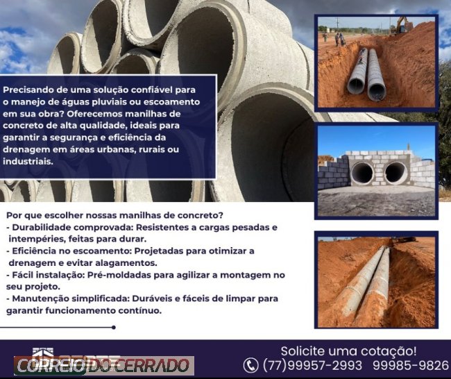 Manilhas de concreto pré-moldadas com diâmetros de 400mm a 1500mm, ideais para drenagem pluvial, esgoto e canalização de córregos.