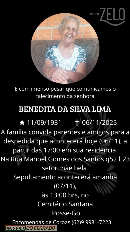 O Grupo Zelo e a família Silva Lima, comunicam com pesar o falecimento de Benedita da Silva Lima, ocorrido nesta quinta-feira (06), aos 94 anos de idade.