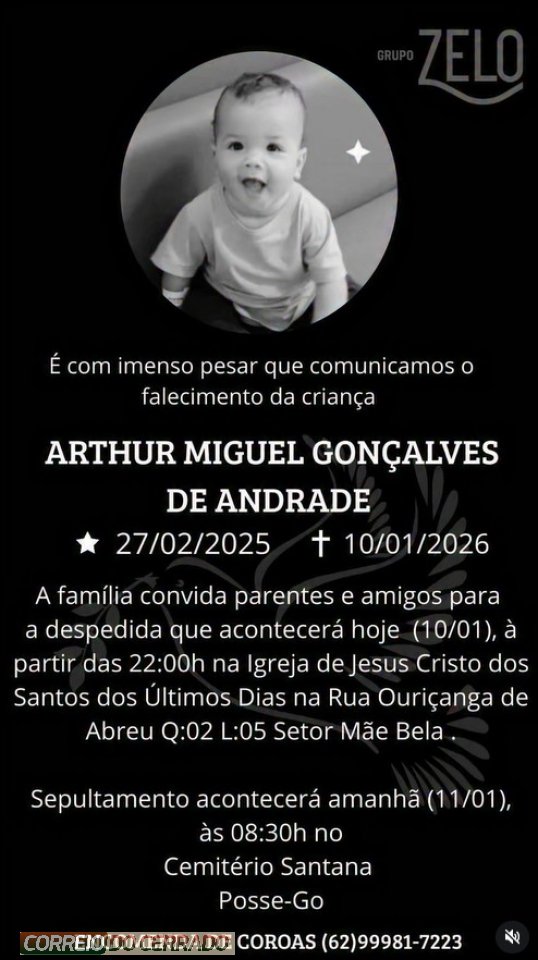 O Grupo Zelo e a família de Andrade, comunicam com pesar o falecimento de Arthur Miguel Gonçalves de Andrade, ocorrido neste sábado (10), aos 10 meses de idade.