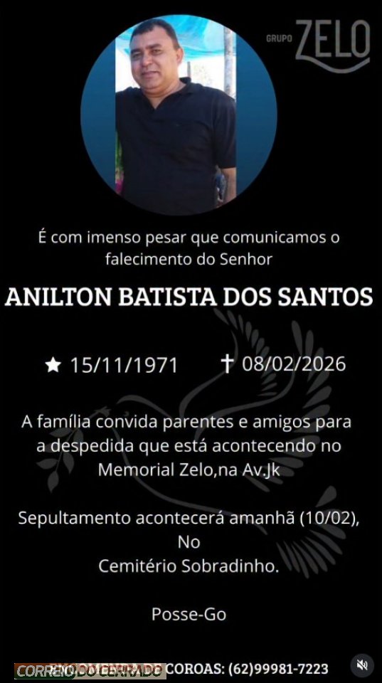 O velório esta sendo realizado nesta segunda-feira (09), A familia convida parentes e amigos para despedida que esta acontecendo no memorial Zelo na Av. JK em Posse/GO.