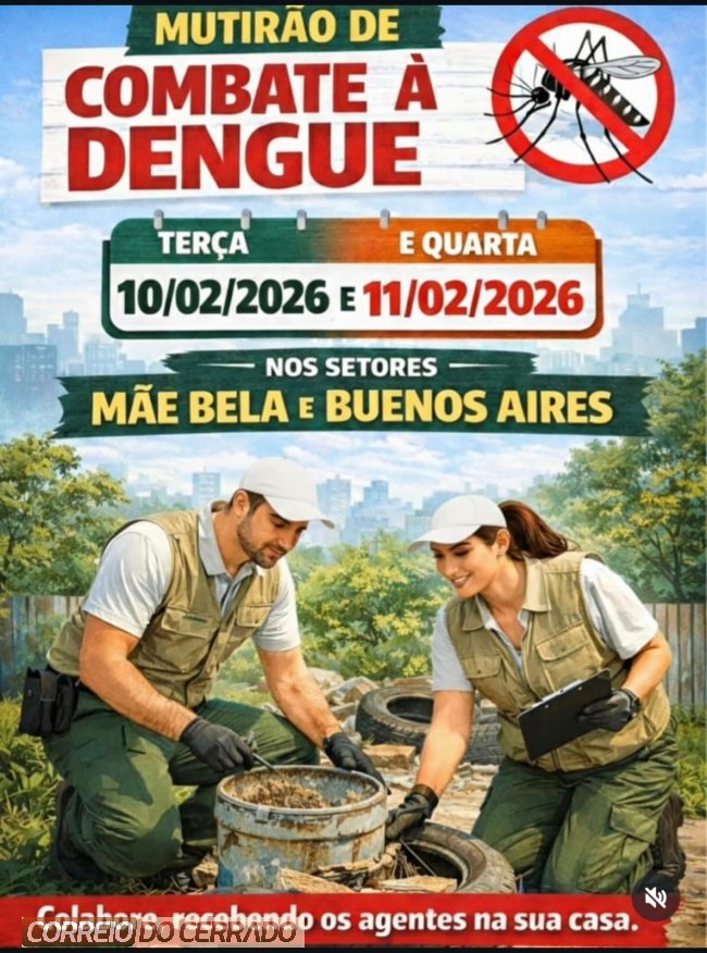 A Prefeitura realiza, nesta terça e quarta-feira (10 e 11 de fevereiro), um Mutirão de Combate à Dengue nos setores Mãe Bela e Buenos Aires. A ação tem como objetivo eliminar focos do mosquito Aedes aegypti, transmissor da dengue, zika e chikungunya, reforçando a prevenção e a saúde da população.