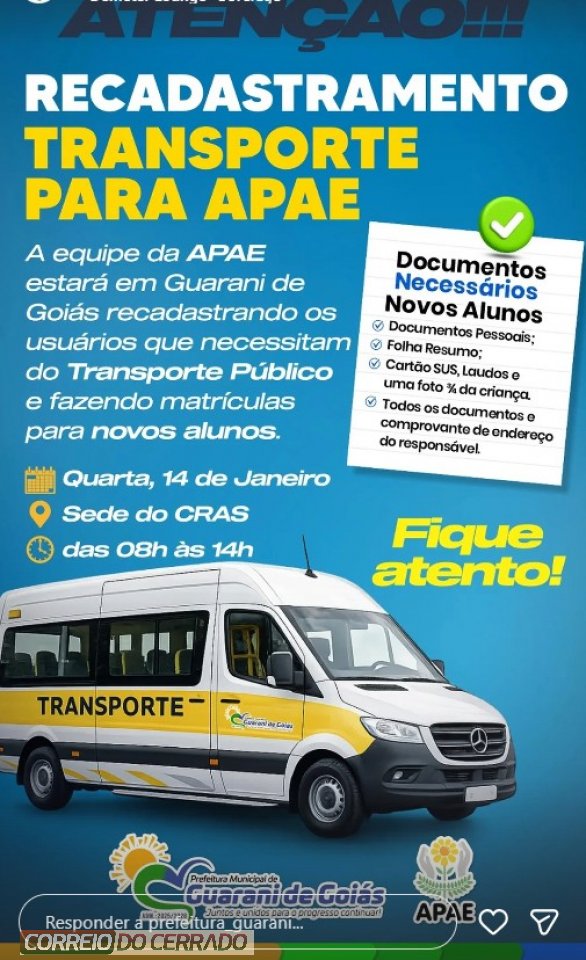 A equipe da APAE estará em Guarani de Goiás nesta quarta-feira (14) para realizar o recadastramento do transporte público destinado aos usuários da instituição, além de efetuar matrículas de novos alunos que necessitam do serviço.