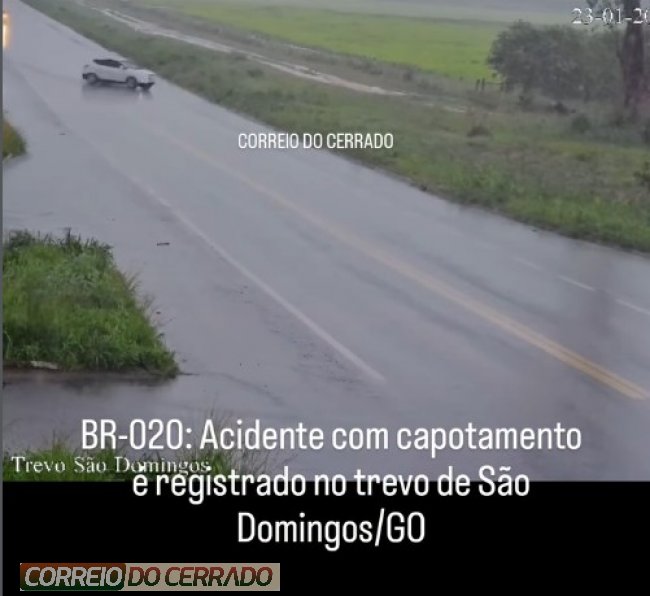 Sexta-feira, 23 de janeiro, um acidente com capotamento foi registrado na BR-020, no trevo de São Domingos/GO. Imagens do local mostram que o veículo aquaplanou na pista, perdeu o controle da direção e acabou capotando às margens da rodovia.