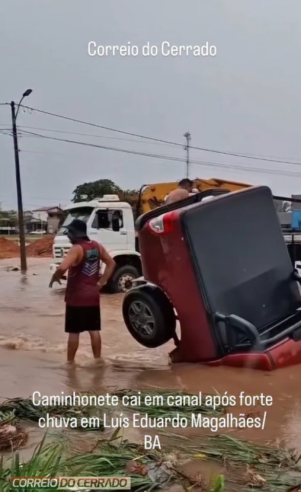 Na manhã desta quinta-feira, 27 de novembro, uma caminhonete acabou caindo dentro de um canal após tentar passar por uma via completamente alagada no bairro Mimoso 1, em Luís Eduardo Magalhães/BA. O município foi atingido por um forte temporal que deixou diversos pontos da cidade tomados pela água e trouxe transtornos aos moradores.