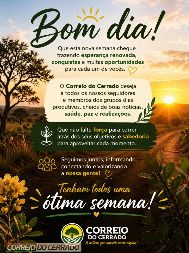 O Correio do Cerrado deseja a todos os nossos seguidores e membros dos grupos dias produtivos, cheios de boas notícias, saúde, paz e realizações. Que não falte força para correr atrás dos seus objetivos e sabedoria para aproveitar cada momento.