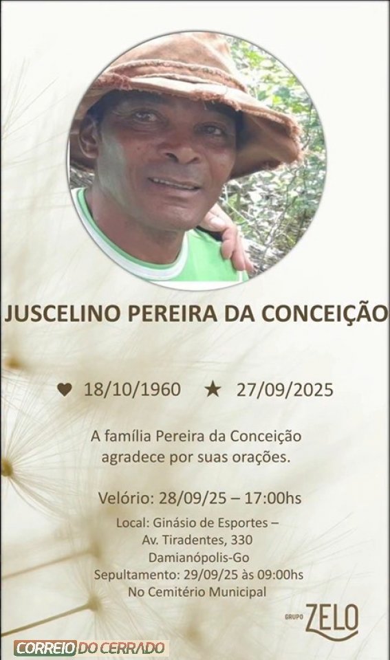 O Grupo Zelo e a família da Conceição, comunicam com pesar o falecimento de Juscelino Pereira da Conceição, ocorrido neste sábado (27), aos 64 anos de idade.