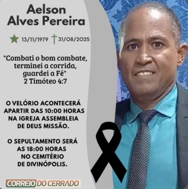 O Correio do Cerrado e a família Pereira, comunicam com pesar o falecimento de Aelson Alves Pereira, ocorrido neste domingo (31), aos 45 anos de idade.
