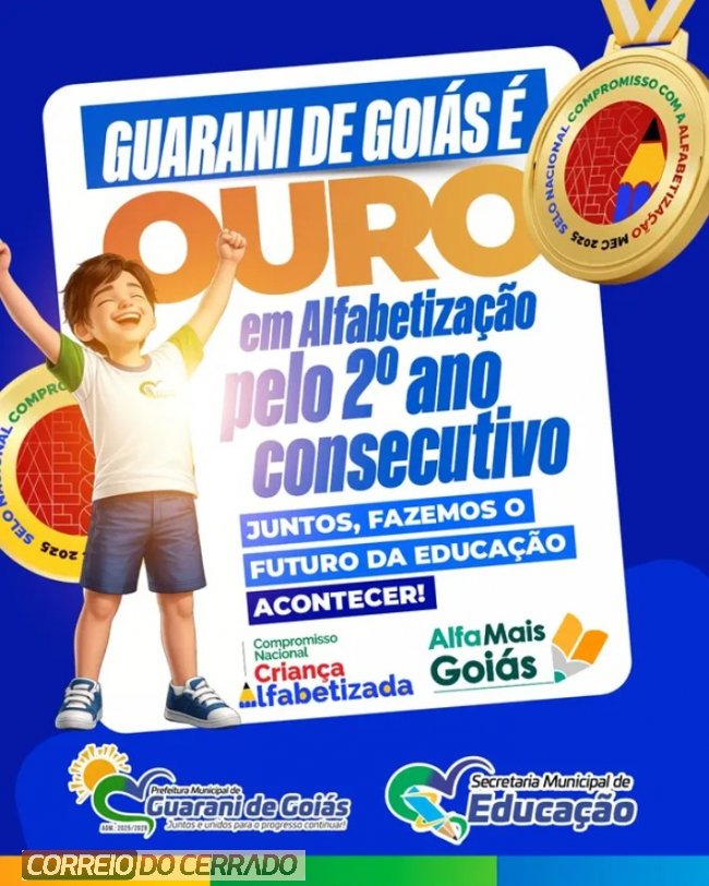 Pela segunda vez consecutiva, Guarani de Goiás celebra a conquista do Selo Ouro no Compromisso Nacional com a Criança Alfabetizada. Foram 110 pontos alcançados com os melhores resultados no processo de alfabetização, o que reflete o compromisso com uma educação pública de qualidade e transformadora.
