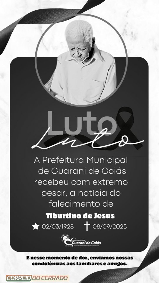 A Prefeitura de Guarani de Goiás e a família de Jesus, comunicam com pesar o falecimento de Tiburtino de Jesus, ocorrido nesta segunda-feira (08), aos 97 anos de idade.