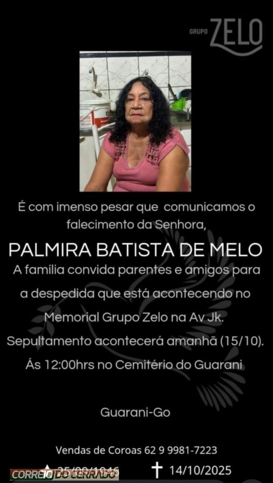 O Grupo Zelo e a família de Melo, comunicam com pesar o falecimento de Palmira Batista de Melo, ocorrido nesta terça-feira (14), aos 79 anos de idade.