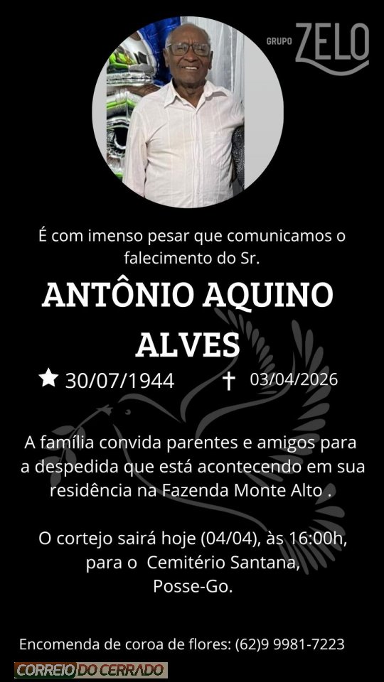 O Correio do Cerrado lamenta, com profundo pesar, o falecimento do Sr. Antônio Aquino Alves, ocorrido no dia 03 de abril de 2026, aos 81 anos.
