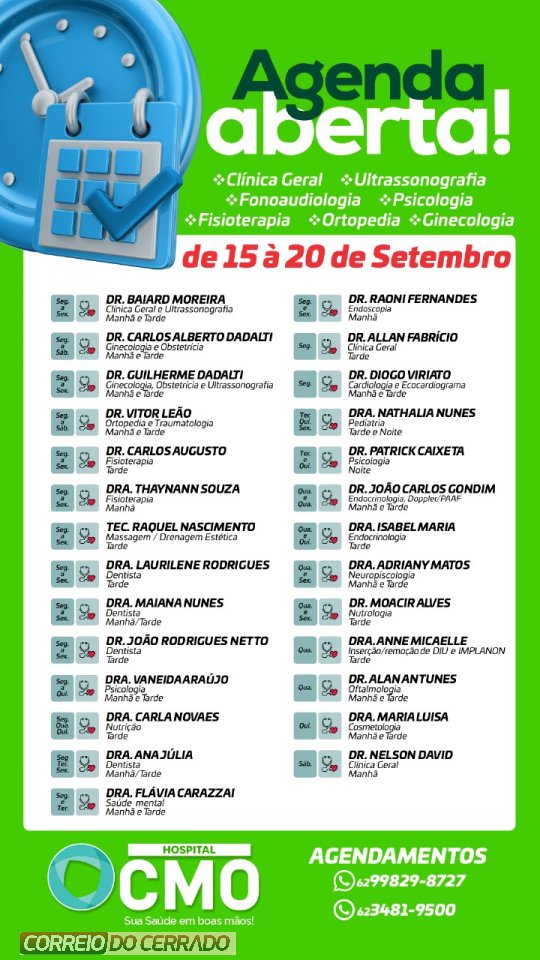 O Hospital CMO de Posse/GO está com a agenda aberta para consultas e procedimentos especializados. Nossa equipe de profissionais está pronta para oferecer um atendimento completo e de qualidade em diversas áreas.