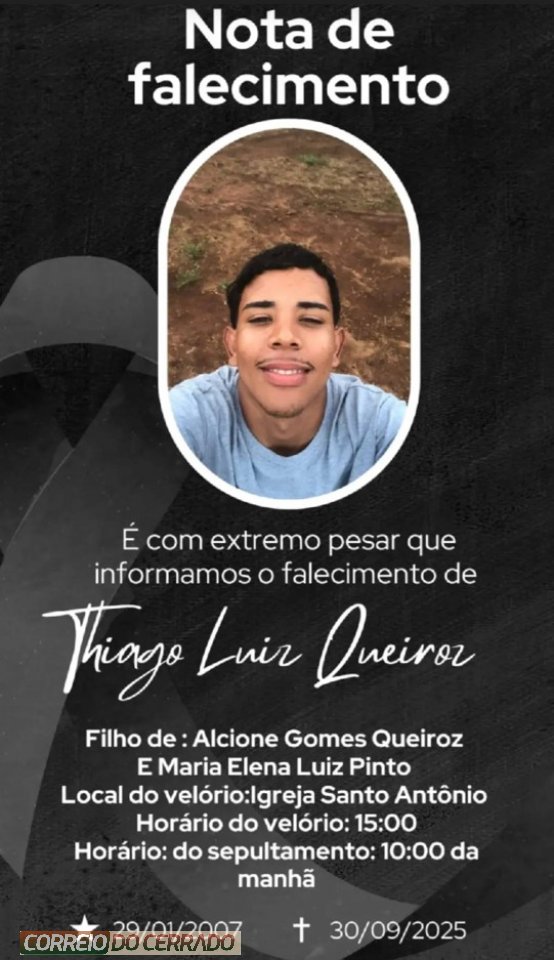 O Correio do Cerrado e a família Queiroz, comunicam com pesar o falecimento de Thiago Luiz Queiroz, ocorrido nesta terça-feira (30), aos 18 anos de idade.