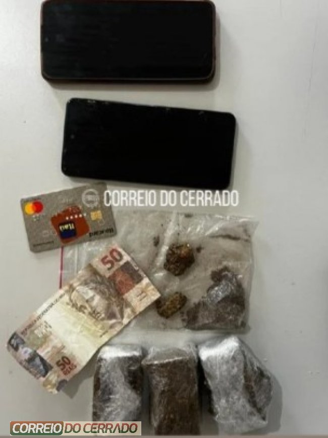 Durante a busca pessoal, foram encontradas porções de substância análoga à maconha, algumas escondidas em suas roupas íntimas e outras nos bolsos, além de uma nota de R$ 50,00 aparentemente falsa e um cartão bancário.