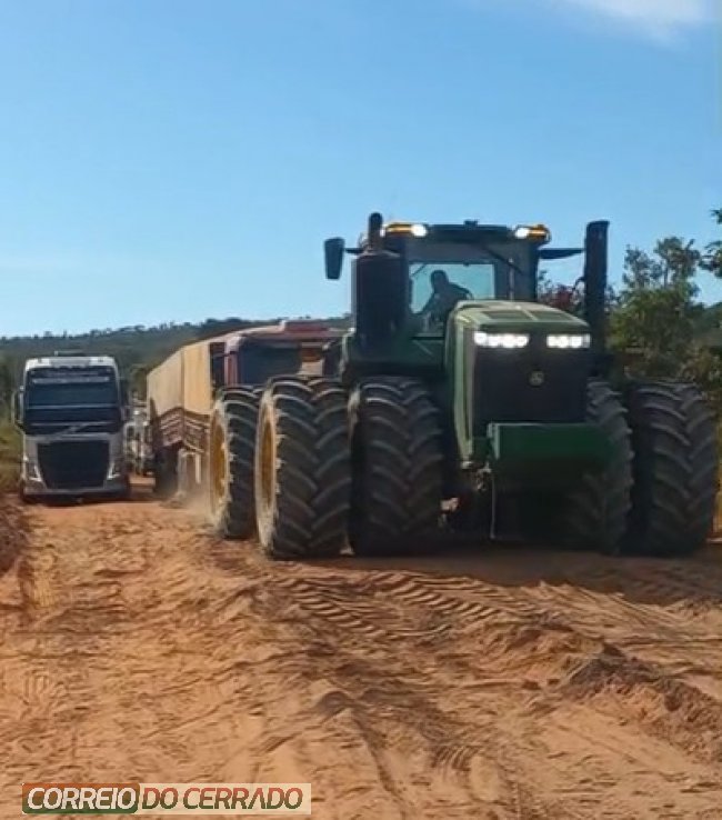 Imagens registradas no local mostram o momento em que o trator realiza o resgate de um caminhão atolado, evidenciando os desafios enfrentados diariamente pelos trabalhadores rurais para manter a logística ativa, especialmente em períodos de condições climáticas adversas.
