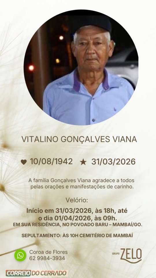 O velório terá início nesta terça-feira (31/03), às 18h, em sua residência, no povoado Baru, em Mambaí/GO, seguindo até quarta-feira (01/04), às 09h.
