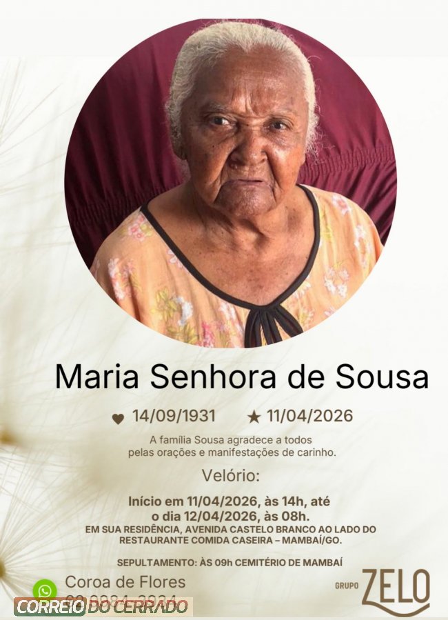 É com profundo pesar que comunicamos o falecimento de Maria Senhora de Sousa, ocorrido neste sábado, 11 de abril de 2026, aos 94 anos.