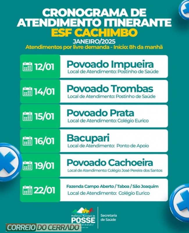 A Secretaria Municipal de Saúde de Posse informa o Cronograma de Atendimento Itinerante do mês de janeiro, realizado pela Equipe do ESF Cachimbo.
