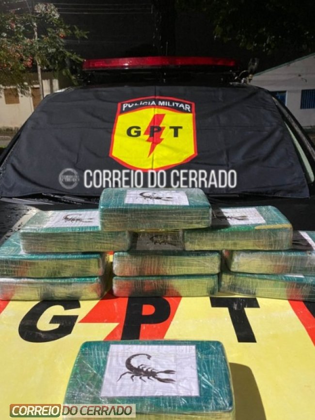 Durante a fiscalização, os agentes encontraram no porta-malas duas caixas de compras de supermercado. No fundo de uma delas, estavam escondidos 10 tabletes de substância análoga à pasta base de cocaína, embalados com fita adesiva verde e marcados com a logomarca de um escorpião, indício comum em carregamentos utilizados por facções criminosas.
