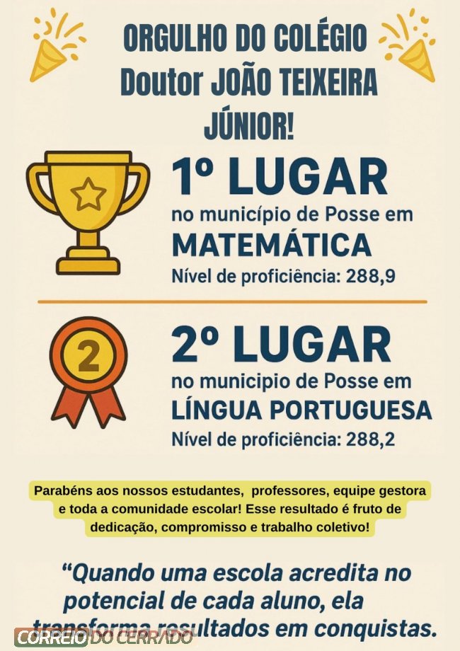 O Colégio Estadual Doutor João Teixeira Júnior, de Posse/GO, alcançou uma vitória marcante no SAEGO – Sistema de Avaliação do Estado de Goiás, reforçando sua excelência e destacando-se como uma das escolas mais bem avaliadas do município.