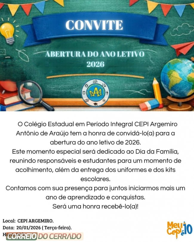 O Colégio Estadual em Período Integral Argemiro Antônio de Araújo, em Posse/GO, comunica a toda a comunidade escolar que, nesta terça-feira, dia 20 de janeiro, às 9h, acontecerá a Abertura Oficial do Ano Letivo de 2026.