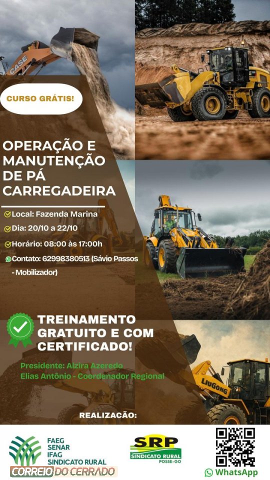 Mais uma oportunidade de qualificação profissional chega a Posse! O Sindicato Rural de Posse, sob a presidência de Alzira Azeredo, em parceria com o Sistema FAEG/SENAR/IFAG, está oferecendo um curso gratuito de Operação e Manutenção de Pá Carregadeira, com certificação reconhecida.