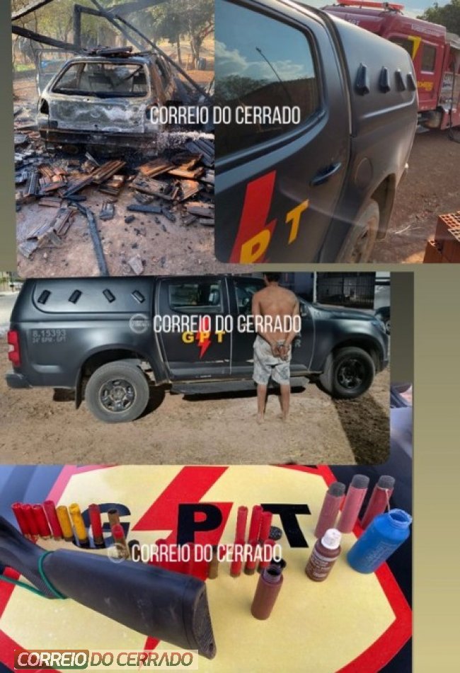 Militares do GPT foram acionados após denúncias de que o morador estava descontrolado e agindo de forma agressiva. Ao chegarem ao local, os policiais encontraram parte da residência em chamas e o automóvel completamente destruído pelo fogo.