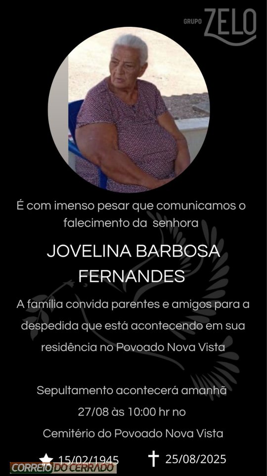 O Grupo Zelo e a família Fernandes, comunicam com pesar o falecimento de Jovelina Barbosa Fernandes, ocorrido nesta segunda-feira (25), aos 80 anos de idade.