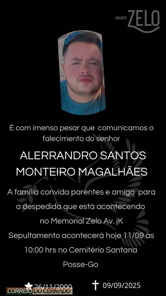 O Grupo Zelo e a família Magalhães, comunicam com pesar o falecimento de Alerrandro Santos Monteiro Magalhães, ocorrido nesta terça-feira (09), aos 24 anos de idade.