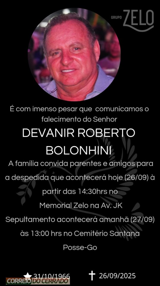 O Grupo Zelo e a família Bolonhini, comunicam com pesar o falecimento de Devanir Roberto Bolonhini, ocorrido nesta sexta-feira (26), aos 58 anos de idade.