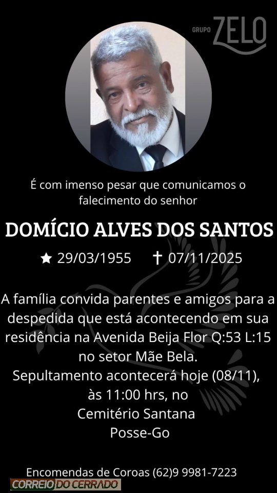 O Grupo Zelo e a família dos Santos, comunicam com pesar o falecimento de Domício Alves dos Santos, ocorrido nesta sexta-feira (07), aos 70 anos de idade.