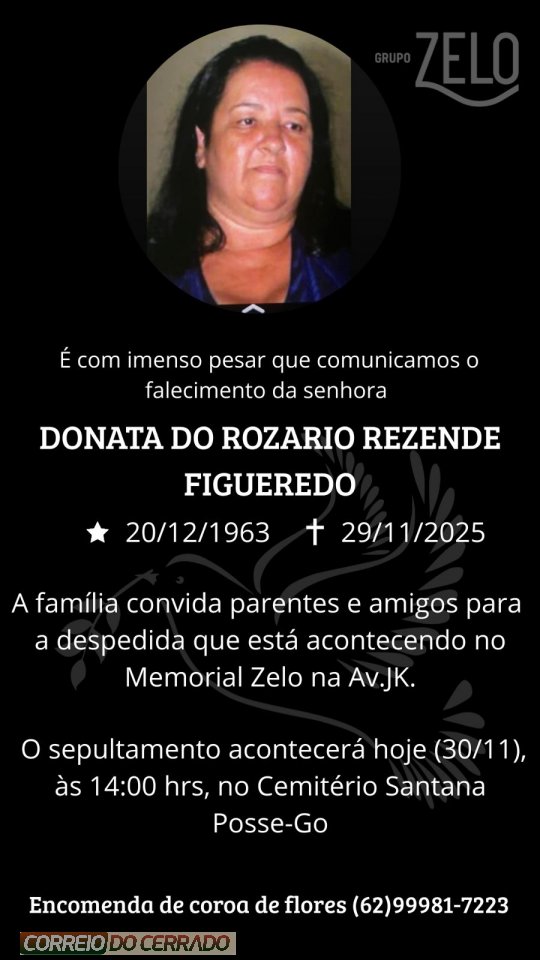 O Grupo Zelo e a família Rezende, comunicam com pesar o falecimento de Donata do Rozario Rezende Figueredo, ocorrido neste sábado (29), aos 61 anos de idade.