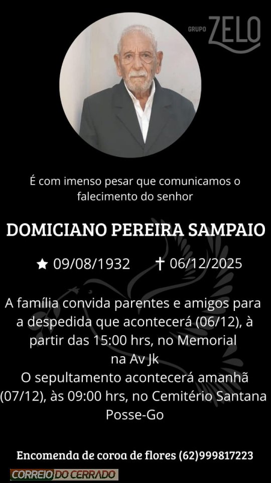 O Grupo Zelo e a família Sampaio, comunicam com pesar o falecimento de Domiciano Pereira Sampaio, ocorrido neste sábado (006), aos 93 anos de idade.