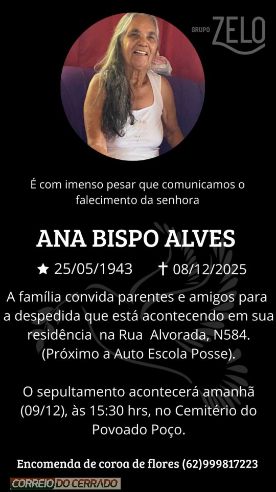 O Grupo Zelo e a família Alves, comunicam com pesar o falecimento de Ana Bispo Alves, ocorrido nesta segunda-feira (08), aos 82 anos de idade.