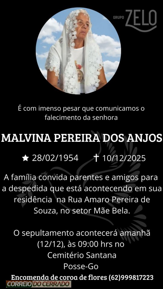O Grupo Zelo e a família dos Anjos, comunicam com pesar o falecimento de Malvina Pereira dos Anjos, ocorrido nesta quarta-feira (10), aos 71 anos de idade.
