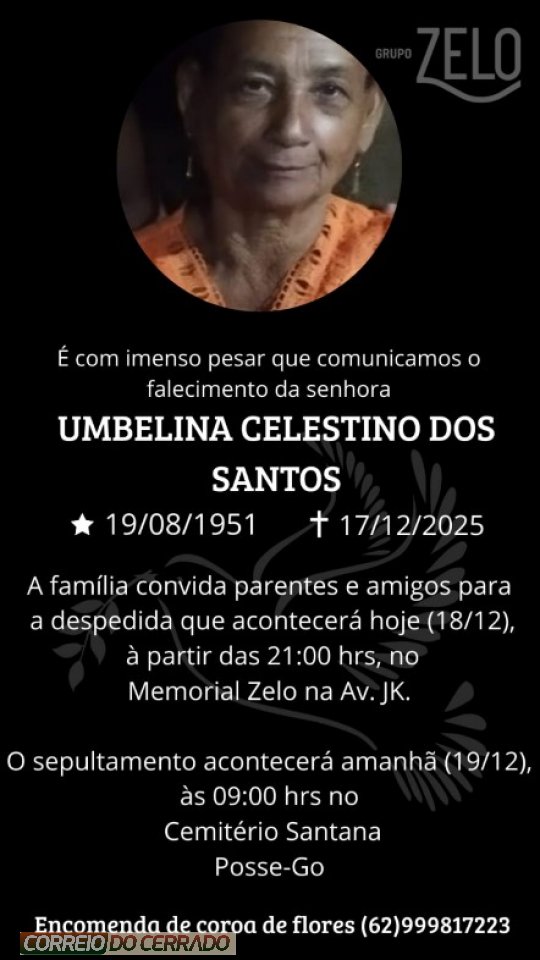 O Grupo Zelo e a família dos Santos, comunicam com pesar o falecimento de Umbelina Celestino dos Santos, ocorrido nesta quinta-feira (17), aos 74 anos de idade.