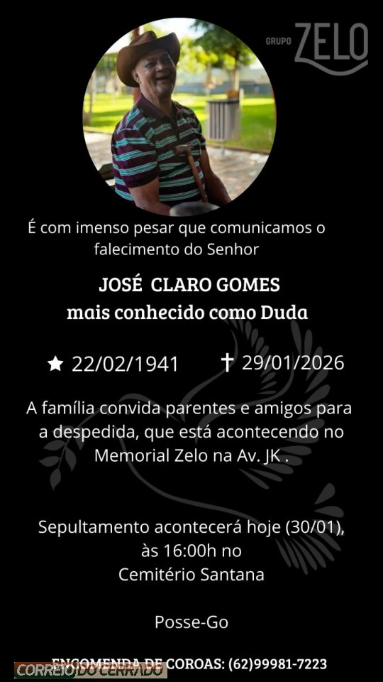 O Grupo Zelo e a família Gomes, comunicam com pesar o falecimento de José Claro Gomes, ocorrido neste quinta-feira (29), aos 84 anos de idade.