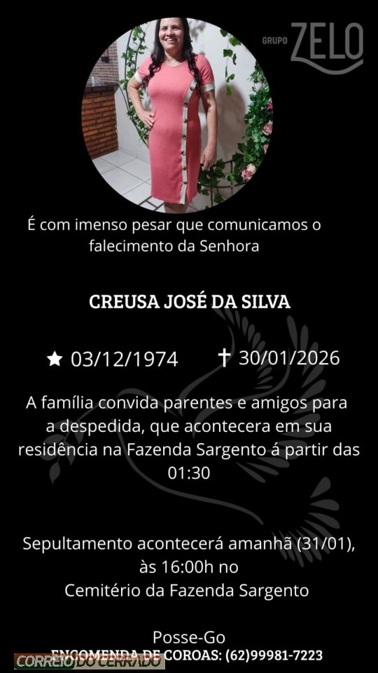 O Grupo Zelo e a família da Silva, comunicam com pesar o falecimento de Creusa José da Silva, ocorrido neste sexta-feira (30), aos 51 anos de idade.